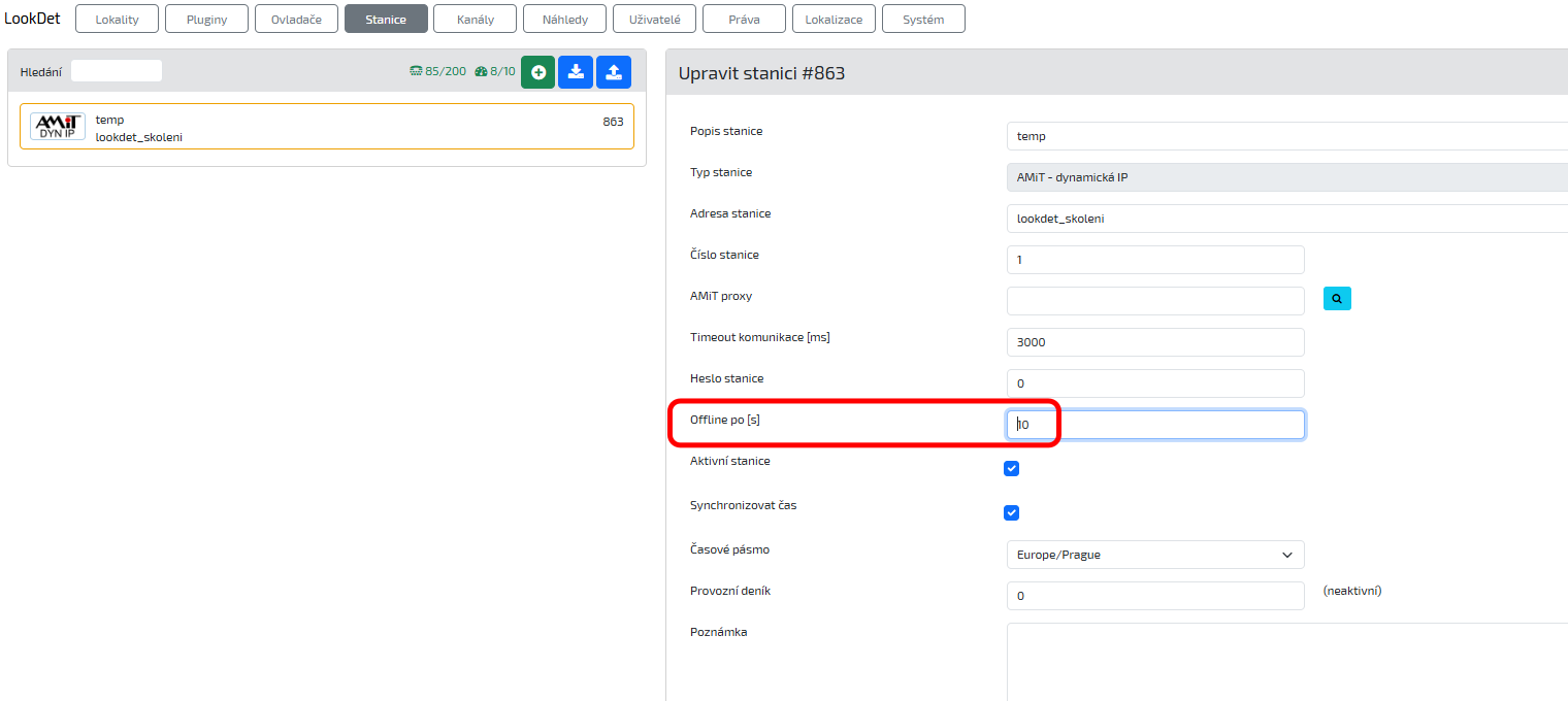 V editaci parametrů stanice vyberte parametr Offline po [s] a hodnotu tohoto parametru podle potřeby změňte. Tato hodnota má vliv na to, po jaké době nekomunikace stanice se údaj v náhledu aktualizuje.