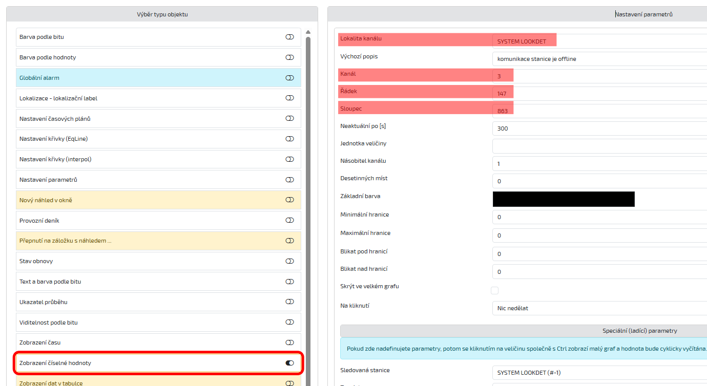 V editaci náhledu vyberte prvek, který chcete, aby zobrazoval stav komunikace a přiřaďte mu požadovanou funkci – zde aplikujeme funkci Zobrazení číselné hodnoty a nastavíme její parametry.