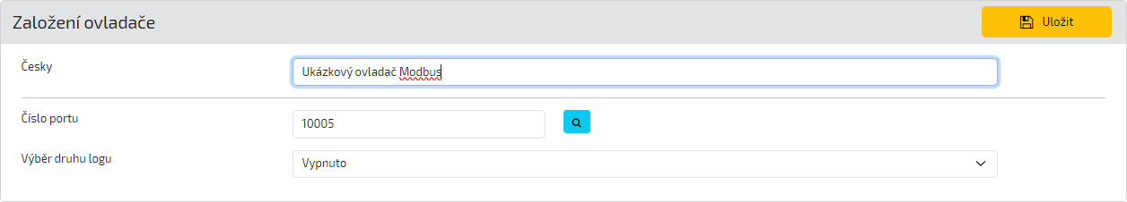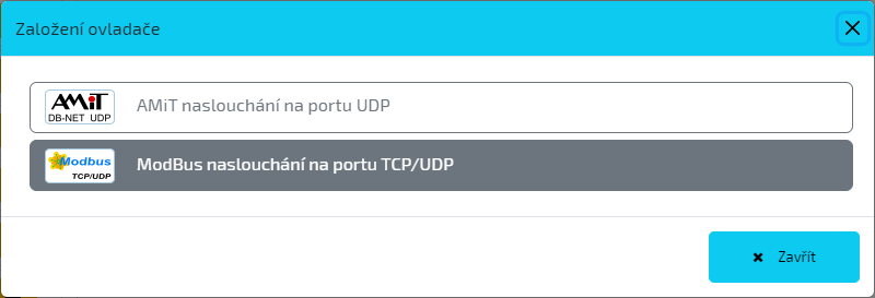 V administraci systému v sekci Ovladače založte nový ovladač typu Modbus naslouchání na portu TCP/UDP
